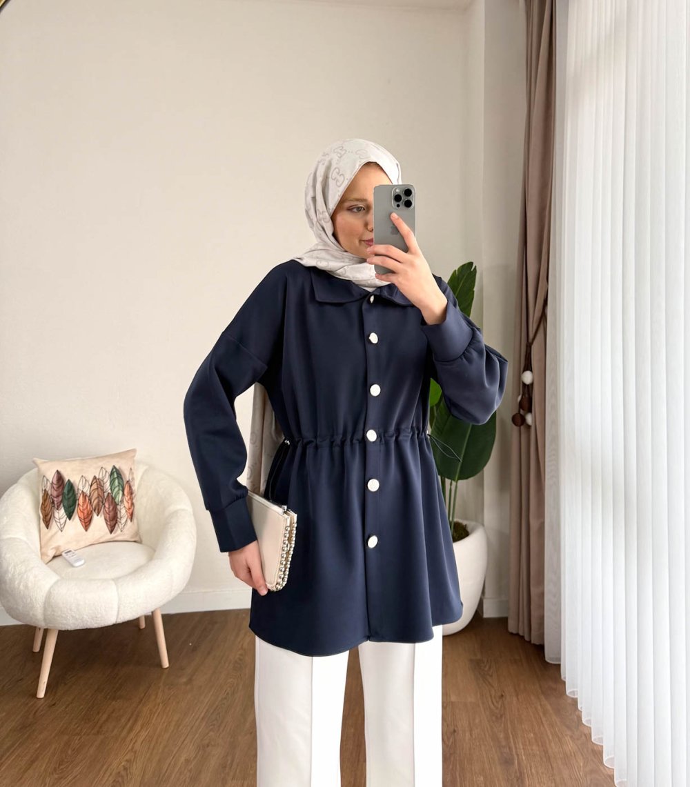 Beli Büzgülü Düğmeli Ceket Lacivert