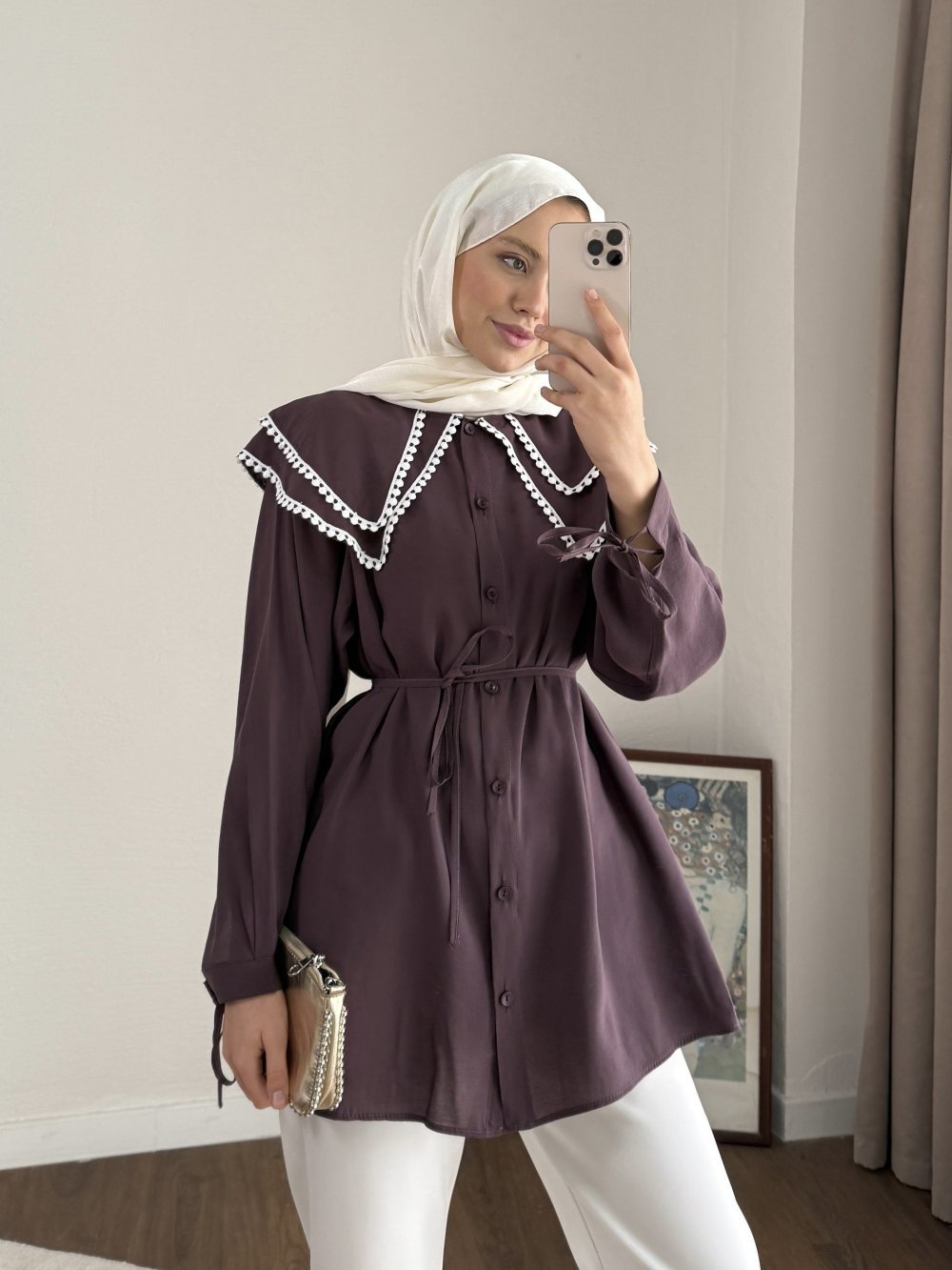Çift Yaka Dantelli Gömlek Mürdüm