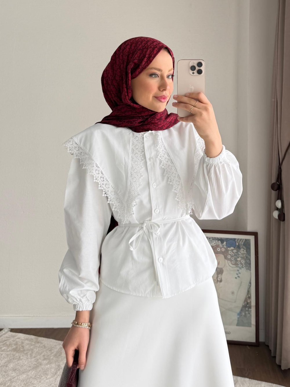 Dantel Yakalı Kısa Gömlek Ekru