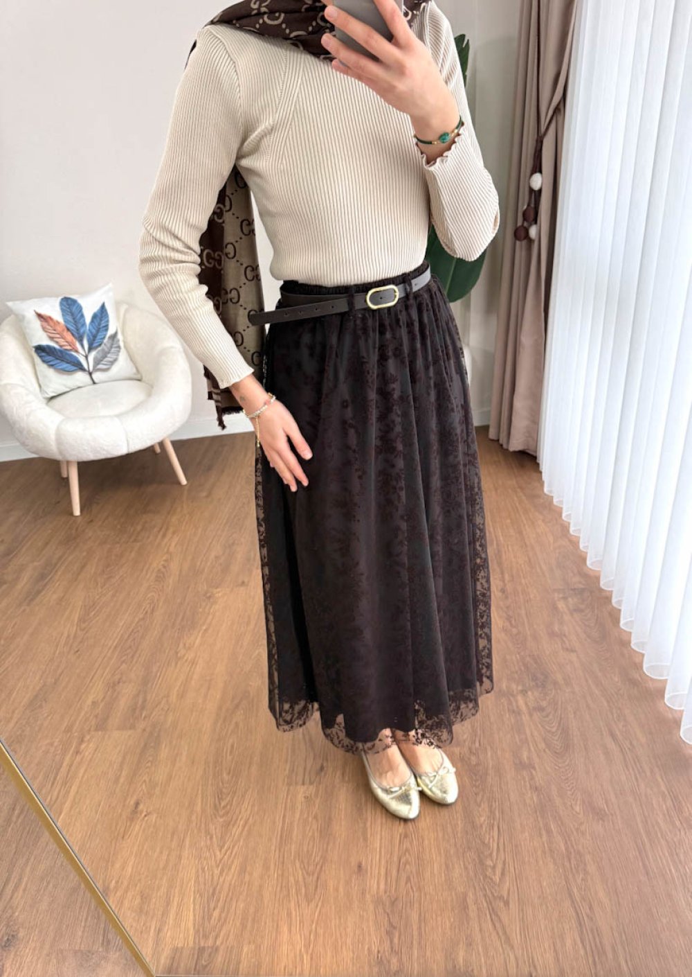 Floklu Tül Etek Kahverengi