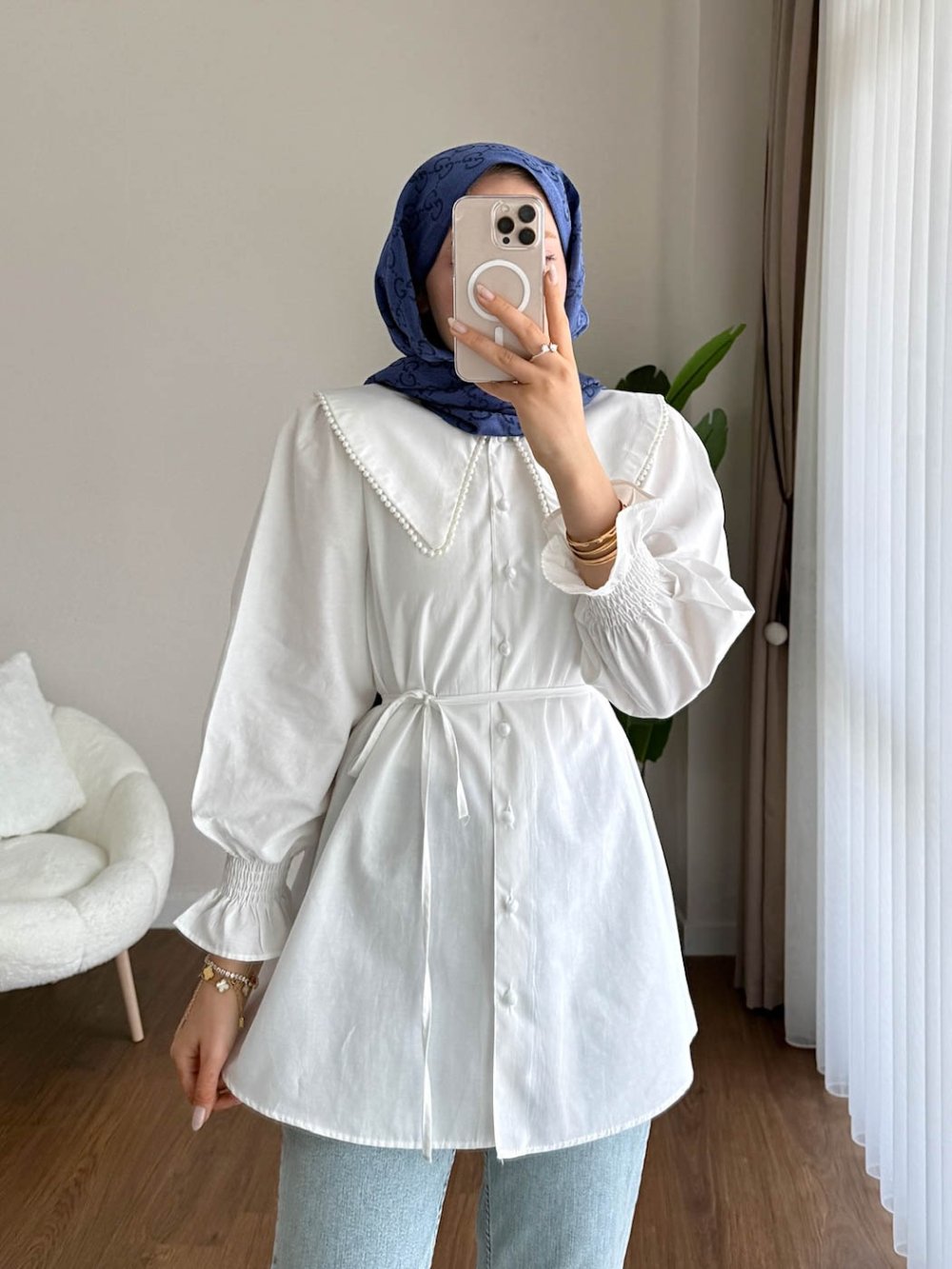 İncili Poplin Tunik Beyaz