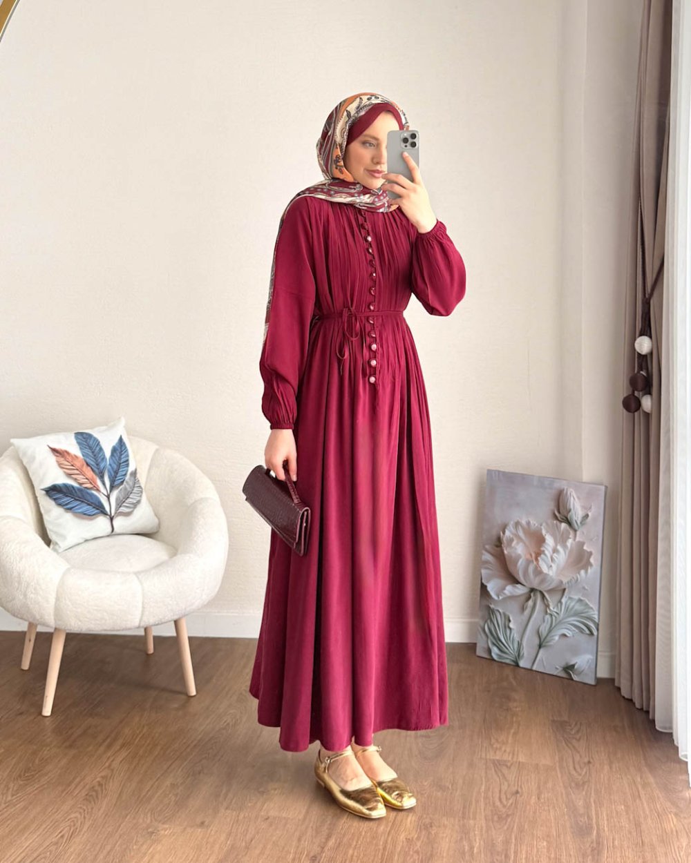 Nervürlü Elbise Bordo