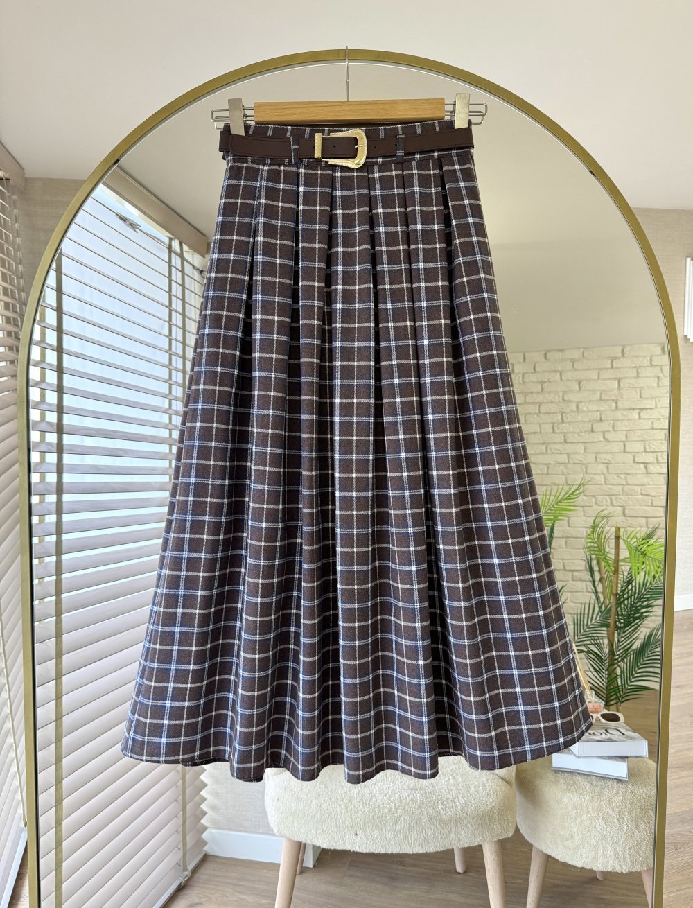 Pileli Ekose Etek Kahverengi