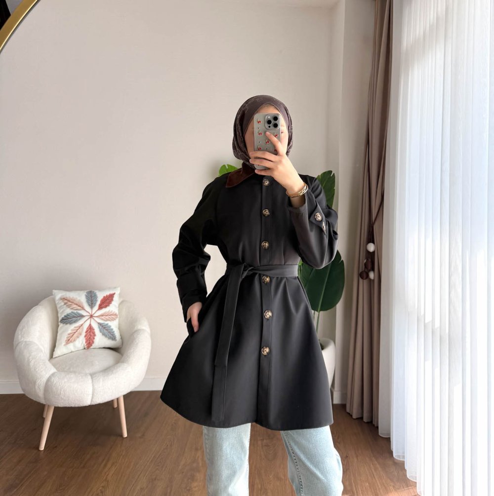 Süwet Yaka Bondit Trenç Siyah