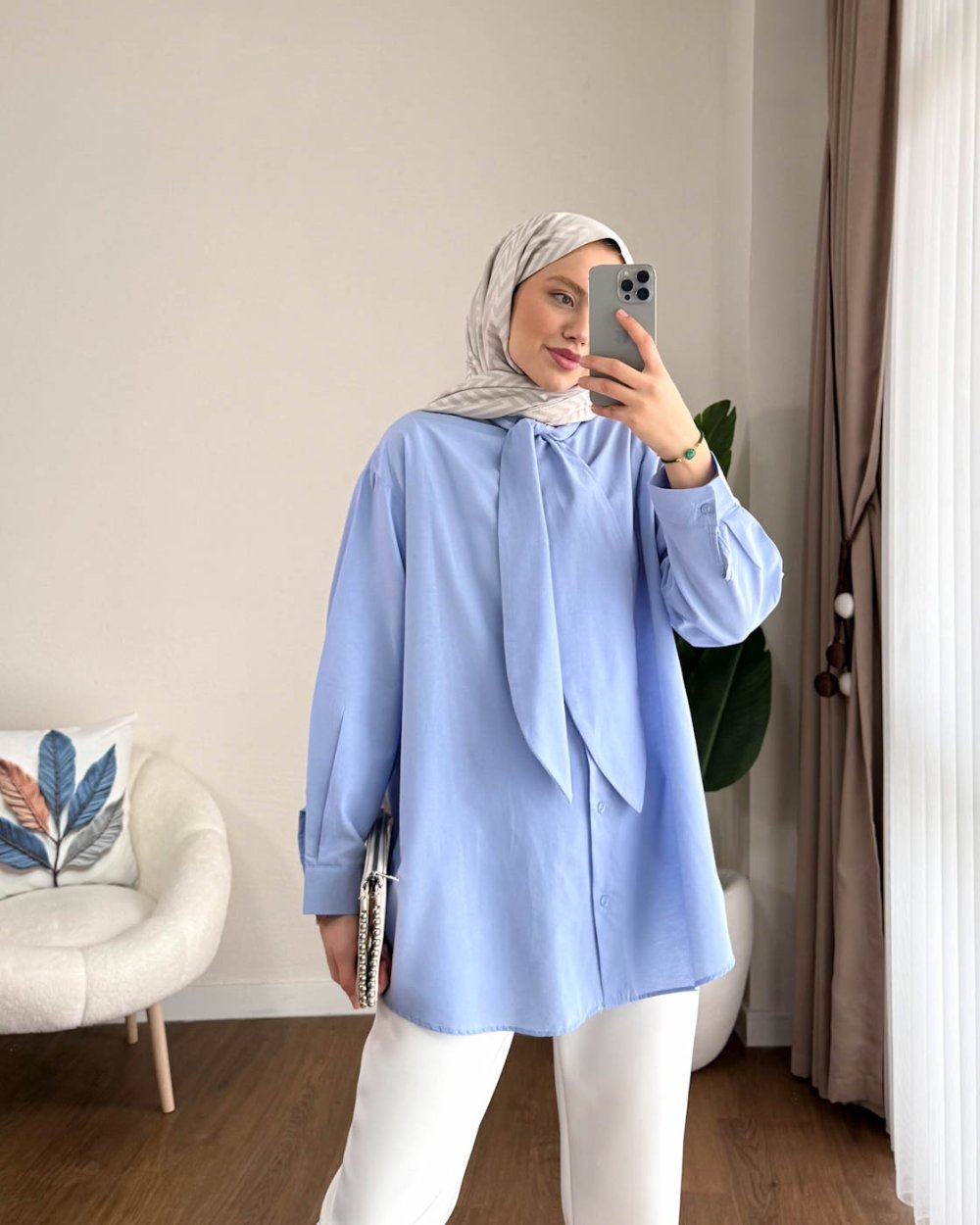Yakası Bağcıklı Oversize Gömlek Mavi